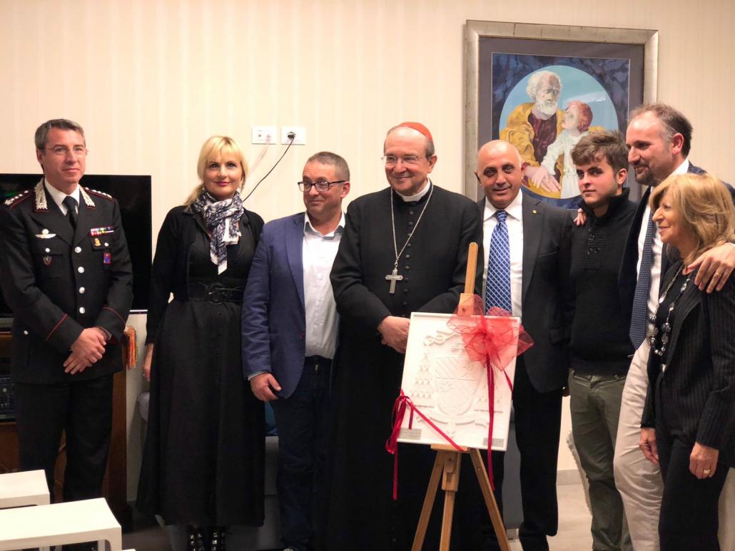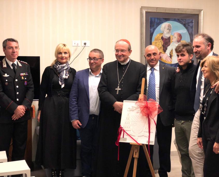 L’Aquila. Il 23 ottobre 2018 alle ore 18:00, presso la “Casa Ospitalità San Giuseppe” gestita dalle Suore “Zelatrici del Sacro Cuore” Maria Ferrari, il Serra Club di L’Aquila e l’ A.C.A.I. (Associazione Cristiana Artigiani d’Italia) hanno incontrato Sua Eminenza il Cardinale Giuseppe Petrocchi Arcivescovo Metropolita di L’Aquila per consegnargli un manufatto in marmo rappresentante lo stemma Cardinalizio, opera di un artigiano aquilano.
