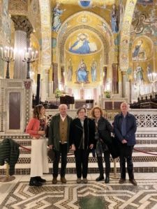 L’incontro col Presidente della Fondazione non si è concluso qui: la sera si è condivisa la cena nella Sala dei Dipinti del Teatro Massimo di Palermo, e la giornata seguente si è fatta una visita a Palermo tra bellezze storico-artistiche e degustazioni varie. Dalla Cappella Palatina e le sale del Palazzo dei Normanni, si è passati alla Cattedrale con i suoi tesori quale la Corona di Costanza, le Tombe dei Reali, tra cui Federico II, e la memoria del Beato Giuseppe Puglisi. Si è visitata la chiesa col monastero di Santa Caterina d’Alessandria con una inevitabile sosta alla dolceria. Nel pomeriggio la passeggiata ha portato all’Oratorio di Santa Cita con gli stucchi di Giacomo Serpotta che rappresentano la battaglia di Lepanto e i misteri del Rosario, poi alla chiesa di San Francesco d’Assisi con una sosta alla nota Focacceria San Francesco; quindi uno sguardo alla chiesa di Santa Maria della Catena per concludere il percorso a Palazzo Steri, sede del Rettorato dell’Università di Palermo, con la sosta per ammirare il quadro di Renato Guttuso La Vucciria.