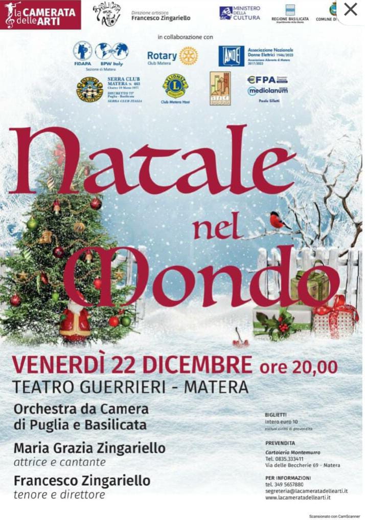 Al Convegno e’ seguito il “Concerto Natale nel mondo” organizzato dalla Camerata delle Arti, con l’orchestra da Camera di Puglia e Basilicata, diretto dal Maestro e tenore Francesco Zingariello, presentato dall’attrice e cantante Maria Grazia Zingariello, con la collaborazione delle Associazioni che hanno sostenuto con impegno e generosità un momento di riflessione condivisa con la comunità.