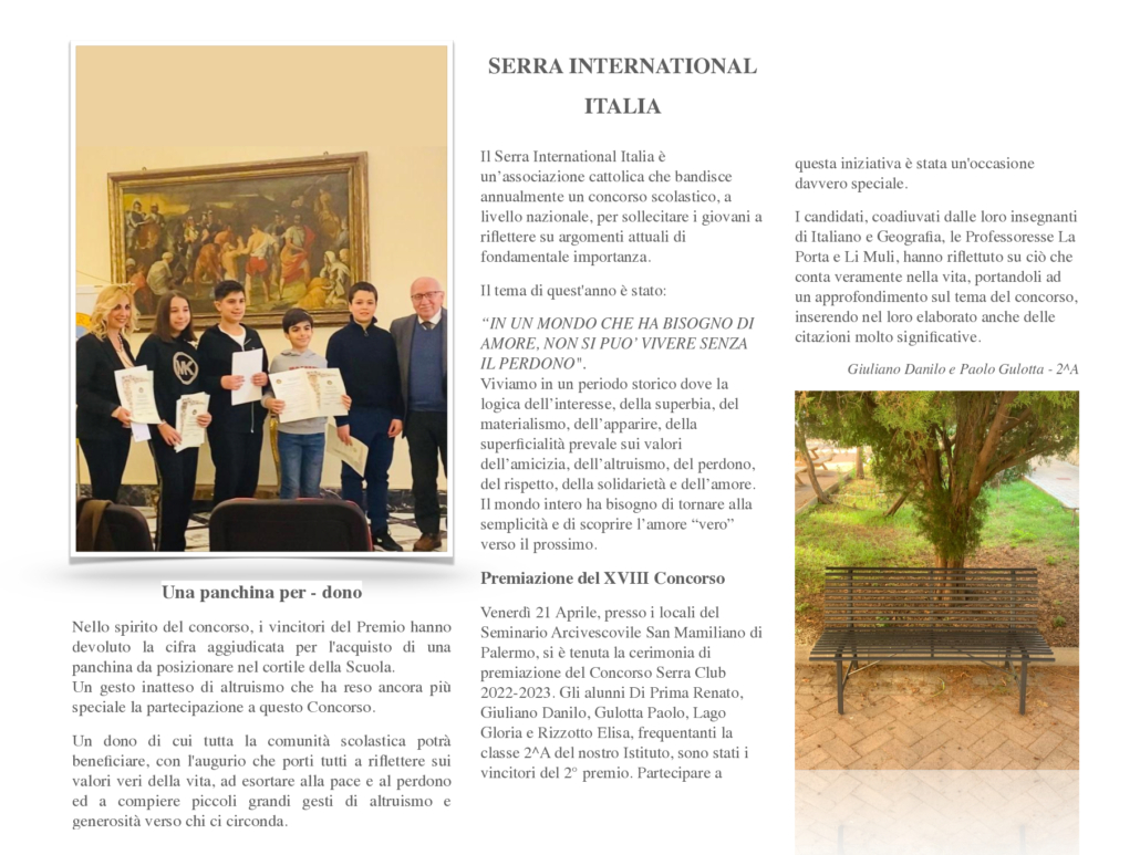 Di anno in anno, il Concorso Scolastico indetto dal Serra Club Italia entra nelle scuole, riscuotendo l’apprezzamento dei Dirigenti Scolastici, dei Docenti, di allievi e famiglie, proponendo temi di riflessione che sollecitano una crescita responsabile. Nell’anno 2022-23 il Concorso ha proposto l’impegnativo tema del perdono e la Scuola “Antonino Pecoraro” di Palermo, Scuola Secondaria di Primo Grado, ha scelto di trasformare il premio ricevuto in un dono, un segno – a ricordo del concorso e del Serra – che permane nella scuola: una panchina per gli spazi verdi attorno ai locali scolastici. Nel giornalino scolastico – che è consultabile online dal sito della Scuola – è stato pubblicato un articolo in merito, che si riporta di seguito.