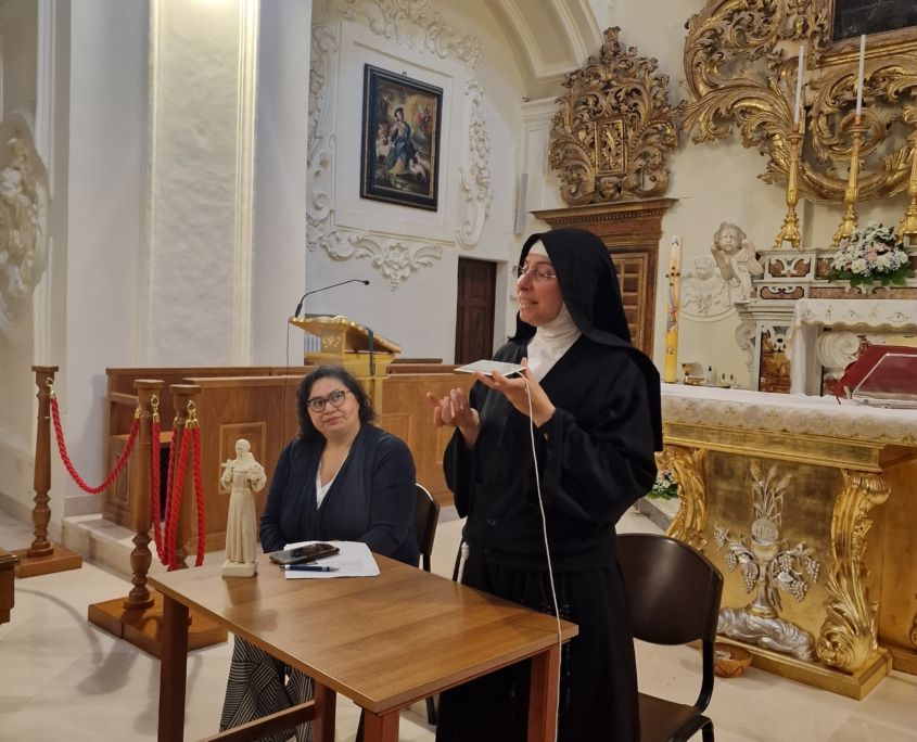 La giornata iniziata con la Santa Messa presieduta dal cappellano distrettuale Don Ennio Tardioli, è proseguita con l’emozionante dialogo, magistralmente moderato dalla presidente del Club di Matera Margherita Lopergolo, tra i soci del Distretto e Suor Chiara Luce, nome di battesimo Lucrezia, entrata nel Monastero di Santa Chiara all’età di 26 anni. La clarissa ha centrato la sua testimonianza sul silenzio abitato dalla Parola che plasma i nostri cuori, quel silenzio che ci fa buttare giù la maschera per trovare la nostra identità. Ciò che attrae e sorprende i giovani è il cuore che si mette al servizio degli altri.