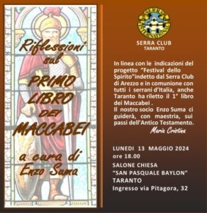 Il Serra Club di Taranto lunedì 13 maggio, presso la sala conferenze della Chiesa di San Pasquale Baylon, ha presentato al Club e agli amici dei Serrani le riflessioni sul Primo Libro dei Maccabei , con le quali ha aderito al “Festival dello Spirito” del Serra Club di Arezzo, iniziativa “comunitaria” che ha dato voce ed espressione a tutti i club serrani .