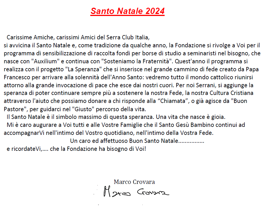 https://www.serraclubitalia.it/wp-content/uploads/2024/12/Sosteniamo-la-Fraternita-la-speranza-24_25.jpg14871060Serra Club Italiahttps://www.serraclubitalia.it/wp-content/uploads/2023/11/logo-serra-club-italia.pngSerra Club Italia2024-12-13 09:15:542024-12-18 22:00:53Fondazione Italiana Beato Junipero Serra – Raccolta fondi “La Speranza” e messaggio di Natale del Presidente Crovara