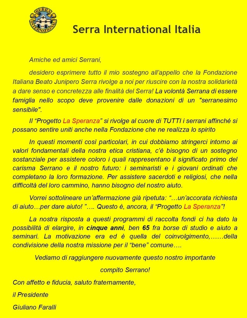 Care Amiche ed Amici, in allegato troverete una lettera del nostro Presidente, Giuliano Faralli, e l’aggiornamento della raccolta fondi “Progetto La Speranza”. Confido sul Vostro aiuto e di tutti i Serrani affinchè possano aggiungersi, alla somma già raggiunta, altre offerte dandoci, così, la possibilità di aiutare con efficacia chi si rivolge al nostro Serra.