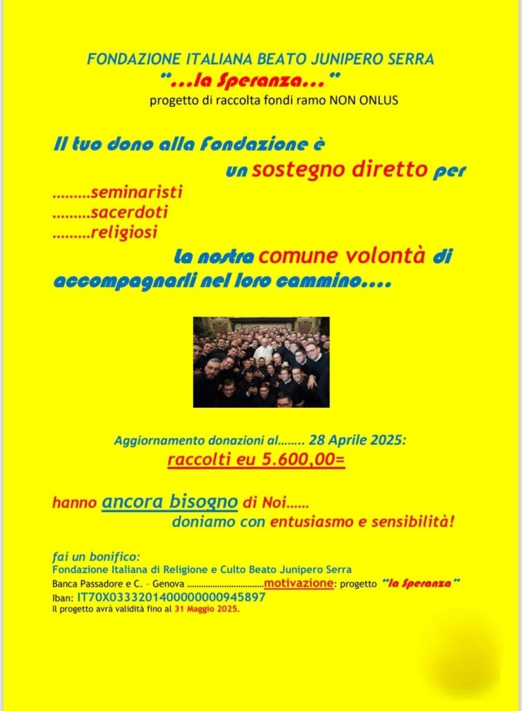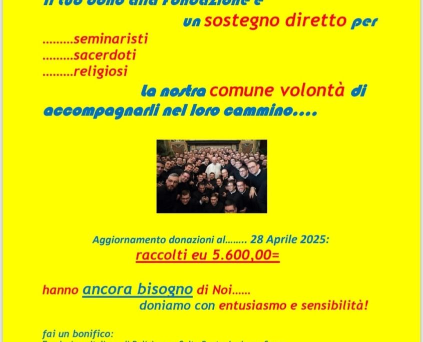 Pertanto, care Amiche ed Amici, Vi invito a prendere ben nota di quanto comunicato perché è importante che il nostro supporto ai seminaristi impegnati nel loro percorso, oggi più che mai, sia tempestivo ed efficace e le precedenti raccolte fondi hanno pienamente dimostrato quanto sia presente e cosciente la Vostra sensibilità.