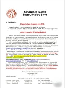 Ricordo, altresì, che le domande, con documentazione allegata, devono essere inoltrate in forma cartacea originale a mezzo raccomandata a.r. e pervenire, entro la data indicata del 31 Maggio pv., all’indirizzo della Segretaria della FIBJS, Sig.ra Grazia Buggiani- via Marzana, 16 -56028 – San Miniato (Pi), oppure per posta elettronica PEC su PEC al seguente indirizzo: fondazione.bjserra@legalmail.it.
