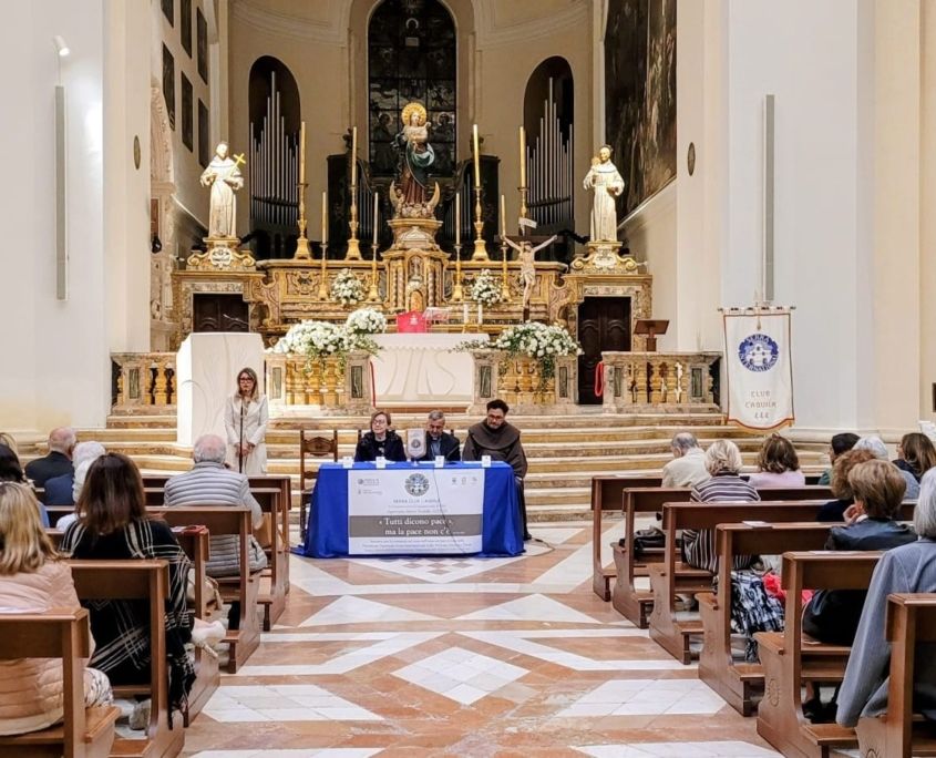 La presidente del club aquilano Giovanna Renzetti, in rappresentanza dei numerosi soci presenti, ha ringraziato dapprima gli illustri relatori che hanno abbracciato l’iniziativa assieme alla Chiesa di L’Aquila, l’Ordine dei Frati Minori Francescani della Basilica di San Bernardino ed il Comune dell’Aquila che hanno patrocinato l’evento, poi, ha salutato la comunità intervenuta. Presenti anche diversi rappresentanti di altre associazioni laicali, enti e club service cittadini che hanno risposto all’invito serrano di partecipare a questo incontro di approfondimento nel segno di una trasformazione profonda verso il disarmo. Tra questi, è intervenuto da Roma anche il Governatore del Distretto 72 Serra Italia Roberto Razzano, che segue l’operato dei club serrani tra Abruzzo, Lazio, Campania e Molise.