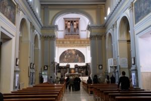 Affabilmente accolti dal parroco, Mons. Eligio Grimaldi, e accompagnati dall’ assistente spirituale, Don Francesco Maranò (grottagliese di nascita e ordinato diacono proprio in questa Chiesa), abbiamo dapprima ammirato la pregevole facciata della Basilica, composta da un portone, un rosone, una cuspide e abbellita da tre edicole raffiguranti l’arcangelo Gabriele, la Vergine Maria e il Cristo in trono. Accanto alla cuspide svetta una cupola rivestita con maioliche realizzate dai ceramisti grottagliesi.