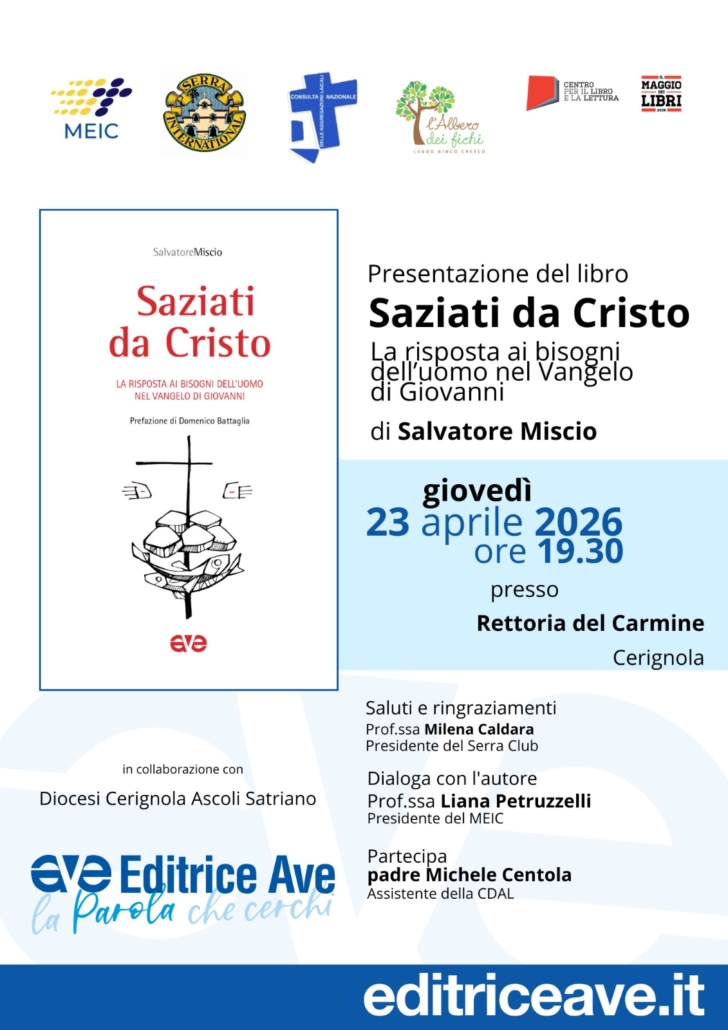 Giovedì 23 aprile, nella Rettoria del Carmine dove per secoli si sono intrecciati preghiera, tradizione e vita cittadina, il Serra club di Cerignola, in collaborazione con altre associazioni cattoliche, ha presentato l’ultimo libro di don Salvatore Miscio docente di ecclesiologia all’ISSR di Foggia, e Vicario Episcopale per la Pastorale dell’Arcidiocesi di Manfredonia-Vieste-San Giovanni Rotondo. “Saziati da Cristo. La risposta ai bisogni dell’uomo nel Vangelo di Giovanni” è un testo agile e profondo che, prende le mosse da un brano delle Sacre Scritture per rileggerlo attraverso le necessità ed i bisogni dell’uomo contemporaneo. “Viviamo in un tempo che corre troppo, dove tutto sembra urgente eppure nulla sazia davvero. Siamo assetati di senso, di relazioni vere, di incontro autentico…e spesso ci accontentiamo di ristori che ci lasciano ancora più stanchi e affamati” scrive don Domenico Battaglia, Arcivescovo di Napoli, nella sua prefazione.